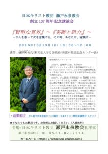 2025年10月19日『ひばりヶ丘駅 ―> 池袋駅 ―> 東京駅 ―> 名古屋駅 ―> 尾張瀬戸駅』に向かった。 電車の車内から、外の風景を観ながら 大いに心が癒された。 瀬戸永泉教会創立137周年記念講演会で、講演【『賢明な寛容』〜『英断と胆力』〜 ー がんを患って死を意識する。その時、あなたは、家族は ー】の機会が与えられた (添付)。 多数の参加者と質問もあり感動した。 終了後、金城カフェのスタッフの瀬戸真知子氏と宮之原光枝氏が駅に送ってくださった。