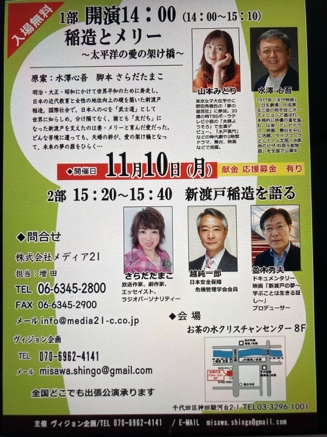 【『新渡戸の夢』をご覧になった、役者さんが、『新渡戸稲造とメリーさんの朗読劇』を開始することを決意されました。 私も微力ながら『朗読劇』を応援をしております。今回朗読される水澤さんは、杉原千畝、賀川豊彦などの朗読劇を海外、国内で行っています。 新渡戸の精神に溢れる『がんと生きる言葉の処方箋』から、『新渡戸の夢』に繋がり、そして『朗読劇』に繋がりました。 嬉しいことです。樋野興夫先生には感謝です。】との連絡を頂いた。