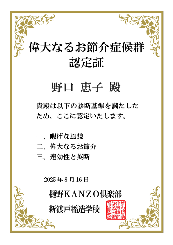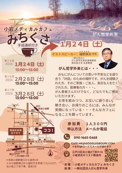 1月24日は【偉大なるお節介症候群 認定証】(添付)を授与されている野口恵子氏(救世軍清瀬病院チャプレン/ボランティアコーディネーター、現在 上智大学大学院実践宗教研究科 死生学専攻 博士後期課程在籍中)の主催で、2024年1月からスタートされた2周年記念『第25回小岩メデイカルカフェ みちくさ』(江戸川区 小岩栄光キリスト教会に於いて)での講演に赴く(添付) 。
