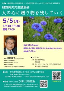 今朝(5月21日) 田鎖夕衣子氏(『がん哲学外来メディカルカフェひばりが丘』代表)から【『ひばりが丘の9周年』(添付)で、やっと念願かなって樋野先生の講演を聴くことができた人が何人かいらして、喜んでくださいました。 先生が見せてくださったスライドに、偉大なるお節介症候群の賞状がありましたが、『お節介の賞状を羨ましいと思いました。私に足りなかったのはこれだと感じました。』と感想を送ってくださった方がおられて、わたしも感銘を受けました。また、『良い師、良い友、良い読書』のすすめにも触れて、少しでも読書を続けたい、とおっしゃっていました。 60代の方ですが、このように樋野先生の言葉に出会い、ご自分を変えたいと願いを持つ方を目の当たりにして、講演会ができたことに深い感謝を覚えております。―― 来週、31日は、『鳩ヶ谷メディカルカフェ』の4周年記念特別講演会(添付)で、樋野先生が招かれています。】の心温まるメールを頂いた。 大いに感動した。 ただただ感謝である。