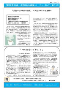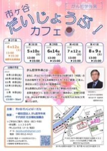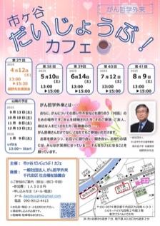 4月12日は、2022年4月から 毎月開始されている 第37回『市ヶ谷だいじょうぶ!カフェ』(田口謙治・桂子夫妻 主催)に赴いた(添付)。 田口謙治氏は『明日を考える会 〜 次世代の社会貢献 〜』(添付)の編集人でもある。 今回、3月28日、29日の【『2025年メディカル・ヴィレッジ in 嬬恋村 がん哲学外来カフェin 万座』『樋野先生お誕生日お祝い会』】に参加されていた方も、 さらに名古屋からも出席されていた。 大いに感動した。 多数の参加者で、質問も寄せられた。 講演後、筆者は別室で4組の個人面談の機会が与えられた。 筆者の『総括』の後、皆様との『花』(瀧廉太郎作曲)を熱唱して終えた。 終了後のスッタフの会議も大いに盛り上がった。