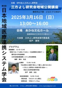 筆者は、日本地域医療連携システム学会理事長として、基調講演『病気であっても病人ではない 〜 社会構築を目指す 〜』の機会が与えれた (添付)。 花戸貴司先生は、主講演『住み慣れた地域で安⼼して暮らし続けるために 〜 三⽅よし研究会と地域の取り組み 〜 』を、地域活動報告は、【蒲生地区『おたがいさん蒲生』 & 愛東地区『学⽣カフェFika』】であった。 2026年の第9回『日本地域医療連携システム学会』の大会長である京都府立医科大学教授 武藤倫弘先生も参加されていた。
