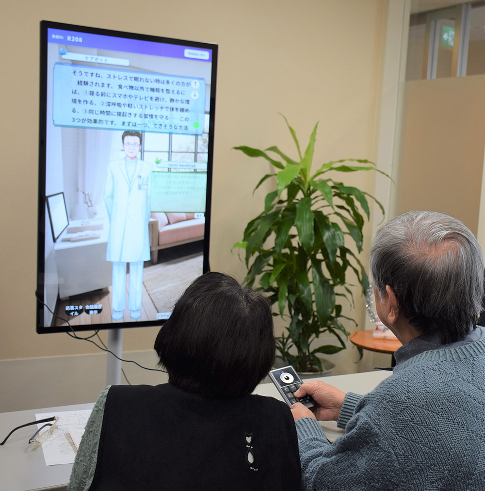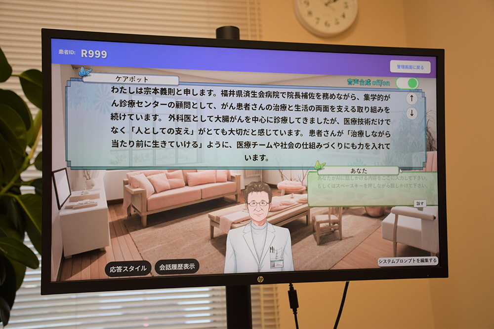 福井県済生会病院ではがん患者および家族が抱える不安や困りごとに対応するため、ケアボットの実証研究を行っており、来年度から活用する予定である。ケアボットは、治療や制度に関する基本的な情報提供を行うとともに、相談内容の整理を行い、必要に応じてがん相談支援センターの相談員による相談対応へとつなぐ役割を担っていた。ケアボットのアバターは宗本先生をモデルとしており、相談者に傾聴・受容・支持的支援・情報提供を行う姿が、宗本先生の対応を彷彿とさせるものとなっていた。